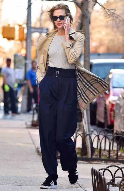 karlie kloss wearing her adidas gazelles with wide leg pants, long sleeve shirt and the classic trench.