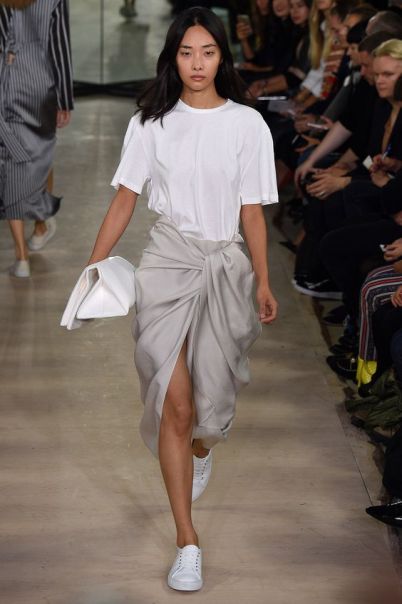 I have mentioned this before on my blog, but I really love the idea of taking an item that is considered casual like the sneaker and pairing it with something more formal like sequins or silk. Much like Joseph Spring 2016 collection. The shoe of choice was not a heel but a white canvas sneaker. Pairing it with a silk skirt and a white t-shirt shows you just how versatile a stylish sneaker can be.